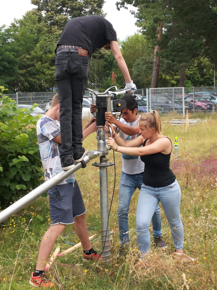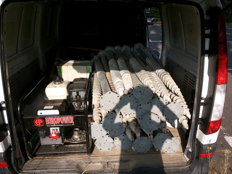 Schraubfundamente - erster Tag! Heute haben wir in 9 Stunden die 48 KRINNER-Schraubfundamente für die 12 Messkuben eingedreht ... sehr schweißtreibende Arbeit am ersten Ferientag!