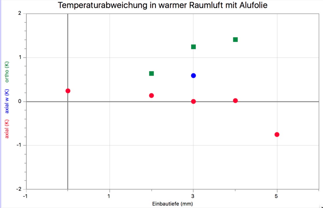 Nach den Ergebnissen aus den vielen Experimenten haben wir die schwarzen Sensoren mit Aluminiumfolie umwickelt. Dann haben wir eine Weile gewartet, bissich die Temperaturen wieder ausgeglichen haben. Man erkennt,dass die axialen Sensoren sehr gutdie Oberflächentemperatur anzeigen. Der weiße Sensor ist verglichen damit deutlich schlechter. Bei den orthogonalen Sensoren sind die Werte schlechter. Das liegt daran, dass wir dort die Alufolie nicht gut um die Kabel und Sensoren wickeln konnten. Wir haben später festgestellt, dass die Alufolie nicht eng anlag und Teile des Schrumpfschlauchs am Sensor offen gelassen hat.