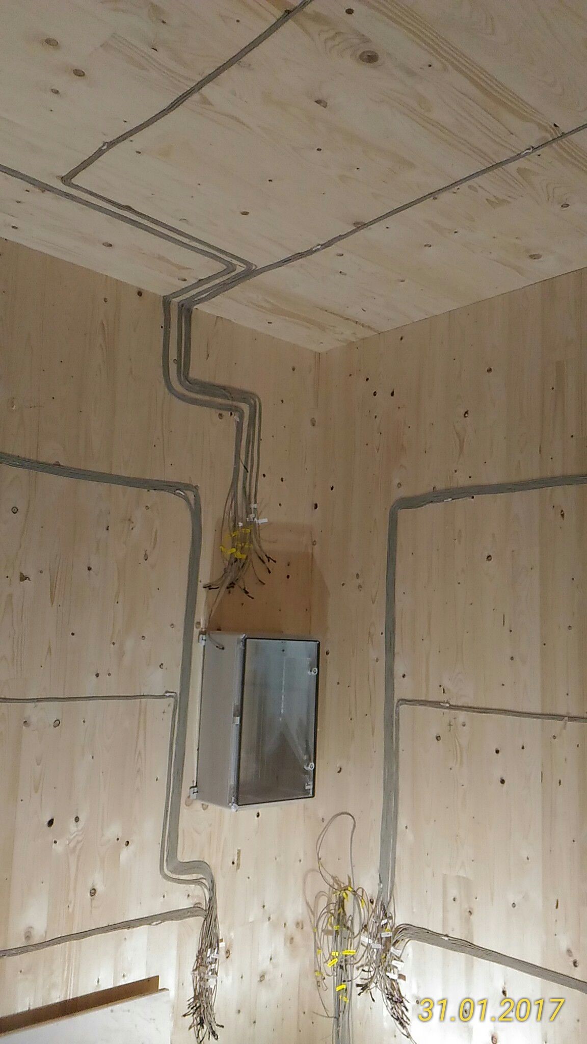 Um zu untersuchen, ob die Sensoren gut sind und wie wir sie einbauen sollen, haben wir eine Kiste gebaut, die eine Hauswand simuliert. Im U-CUBE Projekt haben wir Kuben aus Massivholz mit ca. 10 cm Wandstärke. Wenn es im Winter draußen -10°C kalt ist und innen +20°C sind, beträgt die Temperaturdifferenz durch die Wand ca. 30°C. Unsere Kiste hat vorne eine Wand aus 4 Brettern mit 1,8cm Dicke. Im Inneren der Kiste erzeugen wir durch eine Eis und Wasser-Mischung eine Temperatur von 0°C und im Raum haben wir so ca. 20°C. Damit haben wir eine ähnliche Temperaturdiffernez, wie im Beispiel. Auf diese Oberfläche haben wir die Temperatursensorenin verschiedenen Weisen eingebaut. Es gibt die Möglichkeit, die Sensoren mit der flachen Seite in verschiedenen Tiefen anzukleben oder sie verschieden tief in Bohrlöcher zu schieben. Dies haben wir in 10 verschiedenen Positionen gemacht.