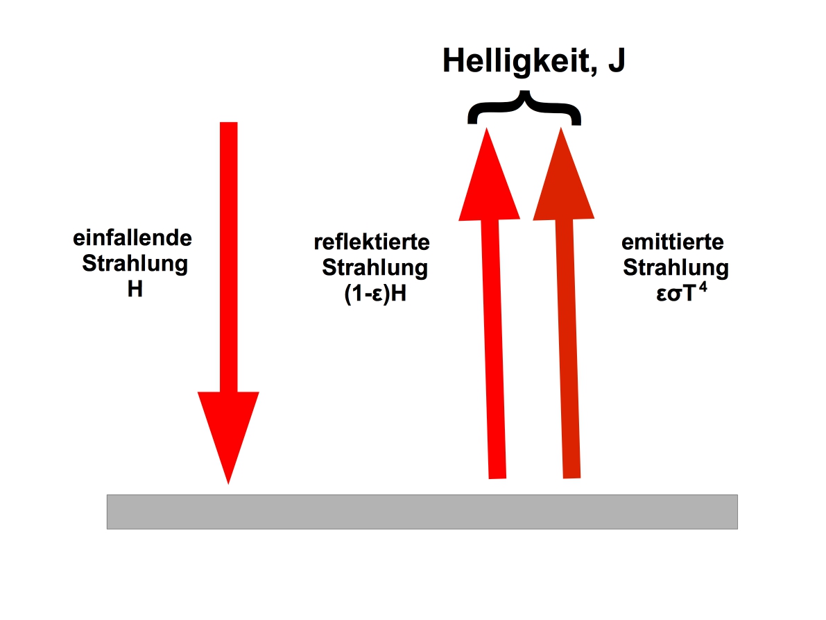 Die virtuellen Temperaturen liegen über den tatsächlichen Oberflächentemperaturen, da bei der Helligkeit der reflektierte Strahlungsanteil mit berücksichtigt wird. Die dargestellte Genauigkeit der Temperaturmessung wird in der Praxis nicht erreicht und dient hier nur der Illustration der Methodik. Aus den gemessenen virtuellen Temperaturen ergeben sich die gemessenen Helligkeiten: